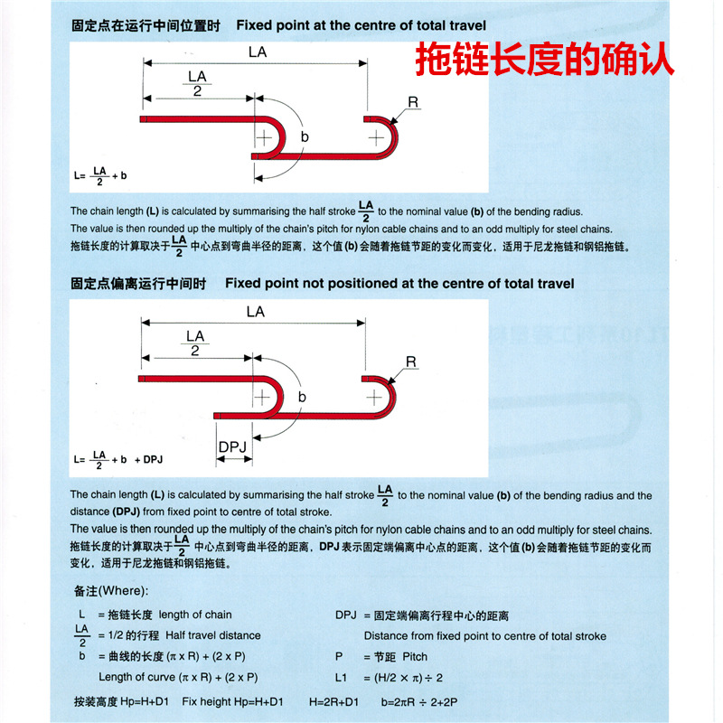 拖鏈長度的計算取決于LA/2中心點到彎曲半徑的距離,DPJ表示固定端偏離中心點的距離,這個值(b)會隨著拖鏈節距的變化而變化,適用于尼龍拖鏈和鋼鋁拖鏈。